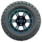 A set of (4) 12-inch GTW® Spyder Blue/Black golf cart wheels Mounted on 23x10.00-12 Rogue All-Terrain Tires
