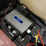 DC/DC voltage reducer/converter to reduce your 48-volt or 36-volt electric cart to 12 volts to run all of your accessories. Connects to entire battery pack instead of just one or two batteries, which improves the life of the batteries. No more having to install separate buss bars to split power. Installing accessories is as simple as crimp and go.