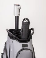 The Player Preferred Cart Bag features premium construction, 14-way full-length dividers, velvet-lined club slots, magnetic rangefinder pocket, and large insulated bottle storage—combining durability, organization, and refined style.